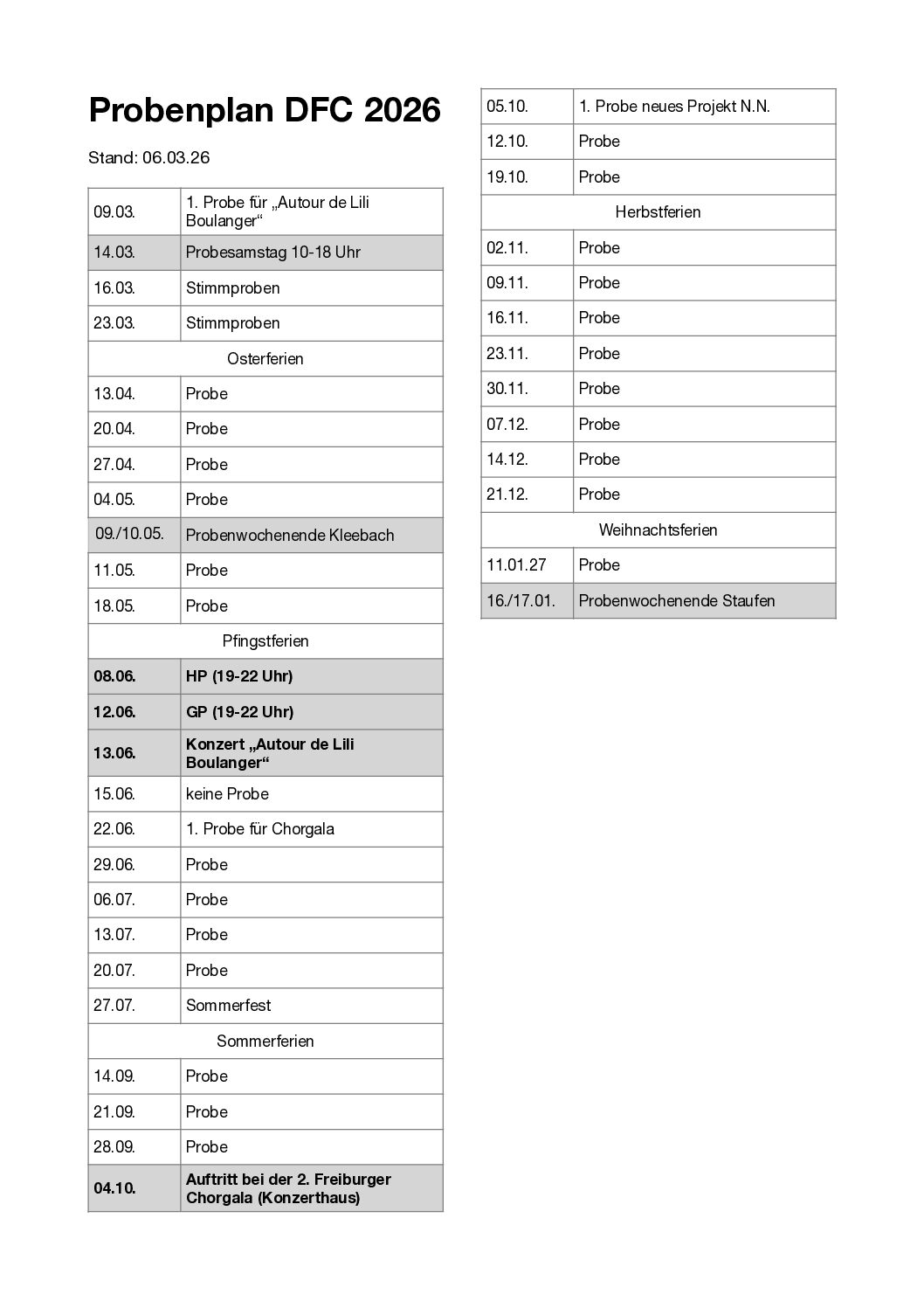 Probenplan nächstes Konzerts
